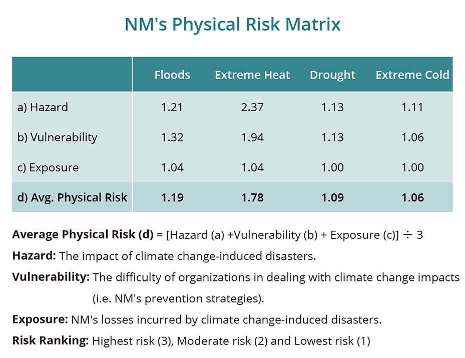 Since 2023, NM has conducted climate change stress testing to detect risks and identify opportunities. Following the “Task Force on Climate-related Financial Disclosures (TCFD)” guidelines and the “Intergovernmental Panel on Climate Change (IPCC — AR6 additions)” scenarios, we analyzed impacts across 10 facilities. Risks identified include Floods (1 site), Extreme Heat (2 sites), Drought (2 sites), and Extreme Cold (2 sites). The matrix summary (Floods = 1.19, Extreme Heat = 1.78, Drought = 1.09, Extreme Cold = 1.06) shows a